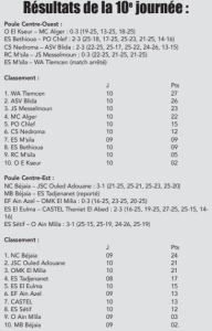 Les résultats des matchs comptant pour la dixième journée du Championnat d’Algérie de la Nationale 1-A messieurs, disputée vendredi dernier, ont confirmé la hiérarchie établie au sein des deux poules de l’élite nationale. Dans le groupe Centre-Ouest, l’ASV Blida a réalisé une excellente opération en s’imposant à Nedroma, un succès précieux qui lui permet de rester au contact de son principal rival et leader de la poule, le WA Tlemcen. De son côté, le NC Béjaïa a assuré l’essentiel dans la poule Centre-Est en décrochant une victoire importante face à son poursuivant direct, la JSC Ouled Adouane. Un résultat qui lui permet de renforcer sa position en tête du classement.