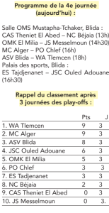 Au-delà des favoris, cette quatrième journée propose plusieurs rencontres intéressantes qui pourraient chambouler le classement général. Le NC Béjaïa croisera le fer avec le CAS Theniet El Abed dans un duel important pour le bas de tableau. Les Béjaouis viseront un succès précieux pour améliorer leur position et préparer au mieux la suite de la compétition, d’autant qu’ils accueilleront plus tard le dernier tournoi des play-offs. De son côté, Theniet El Abed cherchera à débloquer son compteur et à sauver l’honneur dans une phase jusque-là très compliquée. Autre affiche attendue, le derby de l’Est entre l’ES Tadjenanet et la JSC Ouled Adouane promet intensité, engagement et beaucoup d’intensité dans les échanges. Les deux équipes nourrissent encore l’espoir de se rapprocher du podium et joueront gros dans cette confrontation directe. Enfin, l’OMK El Milia et la JS Messelmoun s’affronteront dans un match où chaque point comptera pour améliorer leur positionnement avant les prochaines journées.