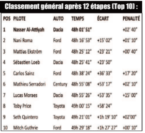 La 12e étape, disputée hier avant le grand final de Yanbu, a définitivement placé Al-Attiyah dans une autre dimension. Auteur du meilleur temps devant Mitch Guthrie, le quintuple vainqueur du Dakar a signé une victoire historique, la 50e de sa carrière sur une spéciale du rallye-raid. Un succès symbolique qui lui permet d’égaler les légendes Ari Vatanen et Stéphane Peterhansel dans ce registre. Grâce à ce nouveau coup d’éclat, le Qatari renforce son avance au général et aborde la dernière étape avec près d’un quart d’heure de marge sur Nani Roma, et plus de vingt minutes sur Mattias Ekström. À moins d’un improbable retournement de situation sur les derniers kilomètres chronométrés, Nasser Al-Attiyah se présente désormais comme le grand favori pour inscrire une sixième fois son nom au palmarès du Dakar.