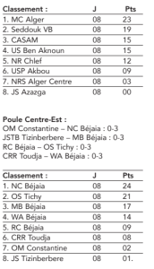 Derrière, la formation Seddouk VB a marqué le pas en s’inclinant sur le score de trois sets à un, face à la solide équipe du CASAM Mohammedia, la grande surprise de cette saison et auteure jusque-là d’un parcours remarquable. De son côté, l’US Ben Aknoun confirme sa bonne dynamique lors de ses dernières sorties en dominant nettement la JS Azazga (3-0), un succès qui lui permet de s’installer à la quatrième place du classement, avec 15 points à son compteur. Dans la Poule Centre-Est, le NC Béjaïa poursuit sa domination et sa maîtrise sans partage. Les Béjaouies ont signé une précieuse victoire en déplacement, en allant s’imposer sur le parquet de l’OM Constantine par trois sets à zéro. Cette victoire leur permet de conforter leur place de leader en comptabilisant 24 points. L’OS Tichy reste également sur sa lancée en disposant du RC Béjaïa (3-0), un résultat qui permet aux Tichisoises d’occuper confortablement la deuxième place avec 21 points. Enfin, cette journée a été marquée par les succès importants du WA Béjaïa et du MB Béjaïa, vainqueurs respectivement de la CRR Toudja et de la JSTB Tizinberber, tous deux sur le score de trois sets à zéro.